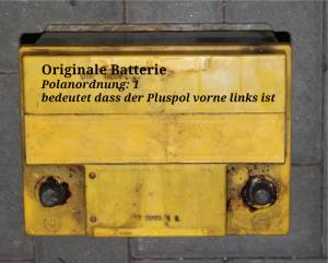 Serienmäßig ist eine Batterie mit Polanordnung 1 verbaut. (Pluspol ist vorne links) Der Einbau einer Batterie mit der Polanordnung 0 (Pluspol ist vorne rechts) ist möglich, hierzu müssen jedoch die ausreichend langen Kabel etwas anders verlegt werden.