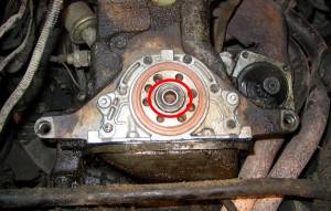 Das Bild zeigt den Motor von hinten ohne Kupplung und Schwungscheibe. Rot umrandet das Pilotlager in der Kurbelwelle und rosa der Kurbelwellensimmering