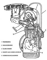 Das System der Kurbelgehäuseentlüftung sorgt für die Ableitung der Dämpfe in den Ansaugbereich des Motors. Im Laufe der Weiterentwicklung des Motors ist das auf unterschiedliche Art und Weise realisiert worden.
