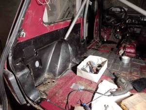 Die Sitze sind mittlerweile eingebaut, genau wie die Mittelkonsole zum „Rallyecockpit“ mutiert ist. Der Öhlkühler tut seinen Dienst, Zusatzscheinwerferchen hocken auf der gekürzten Stoßstange und unterstützen die kläglichen Originalfunzeln.