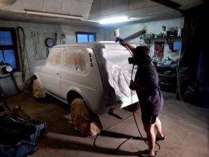 Dann war der Zeitpunkt gekommen, sich ernsthaft mit dem Lackieren der Karosse zu beschäftigen. Die Tage Anfang September waren noch gut warm und so nahm ich die Sache endlich in Angriff. Wir sahen das ganz fatalistisch, mit billigstem Einkomponentenlack in Reinweiß und für die Deko Sprühdosen für 3,99€. Zweimal überschlagen und der Lack ist eh hinüber ;o)
