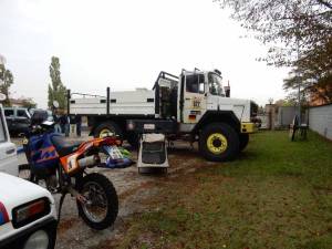 Rüdiger, ein ElChott-Mitstreiter auf dem Motorrad, nimmt unsere „Wettbewerbsreifen“ in seinem Transporter mit nach Voghera, dort stecken wir dann um und übernehmen dafür ´nen Rucksack mit Klamotten, die er nicht auf die Strecke mitnehmen will.
