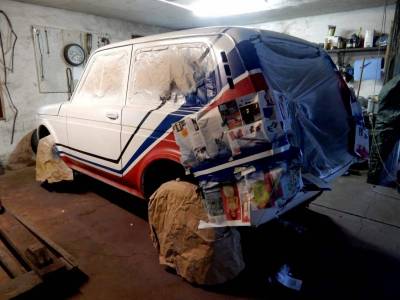 Dann war der Zeitpunkt gekommen, sich ernsthaft mit dem Lackieren der Karosse zu beschäftigen. Die Tage Anfang September waren noch gut warm und so nahm ich die Sache endlich in Angriff. Wir sahen das ganz fatalistisch, mit billigstem Einkomponentenlack in Reinweiß und für die Deko Sprühdosen für 3,99€. Zweimal überschlagen und der Lack ist eh hinüber ;o)